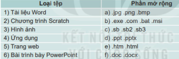 Câu 4: Em hãy ghép mỗi loại tệp ở cột bên trái với 1 phần mở rộng tệp phù hợp ở cột bên phải